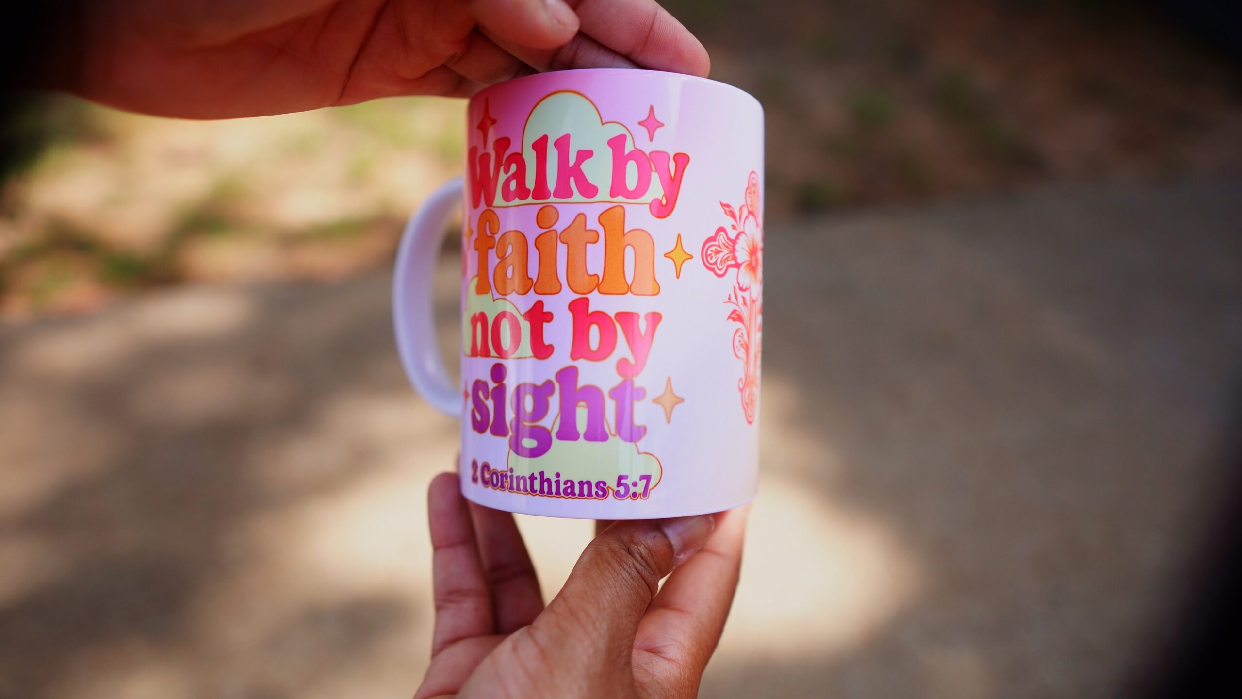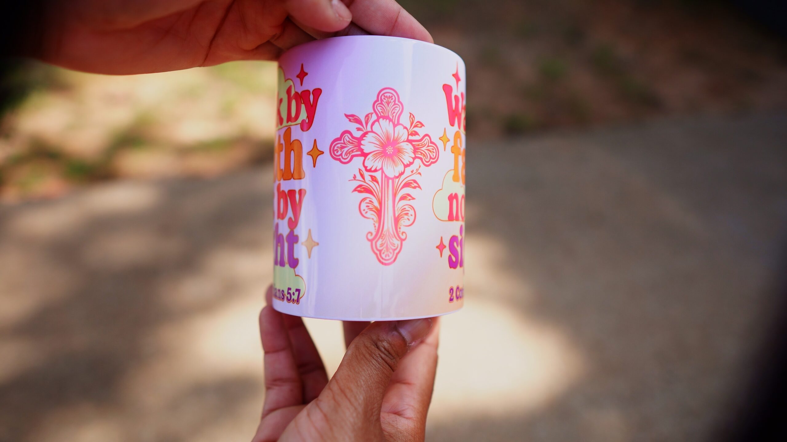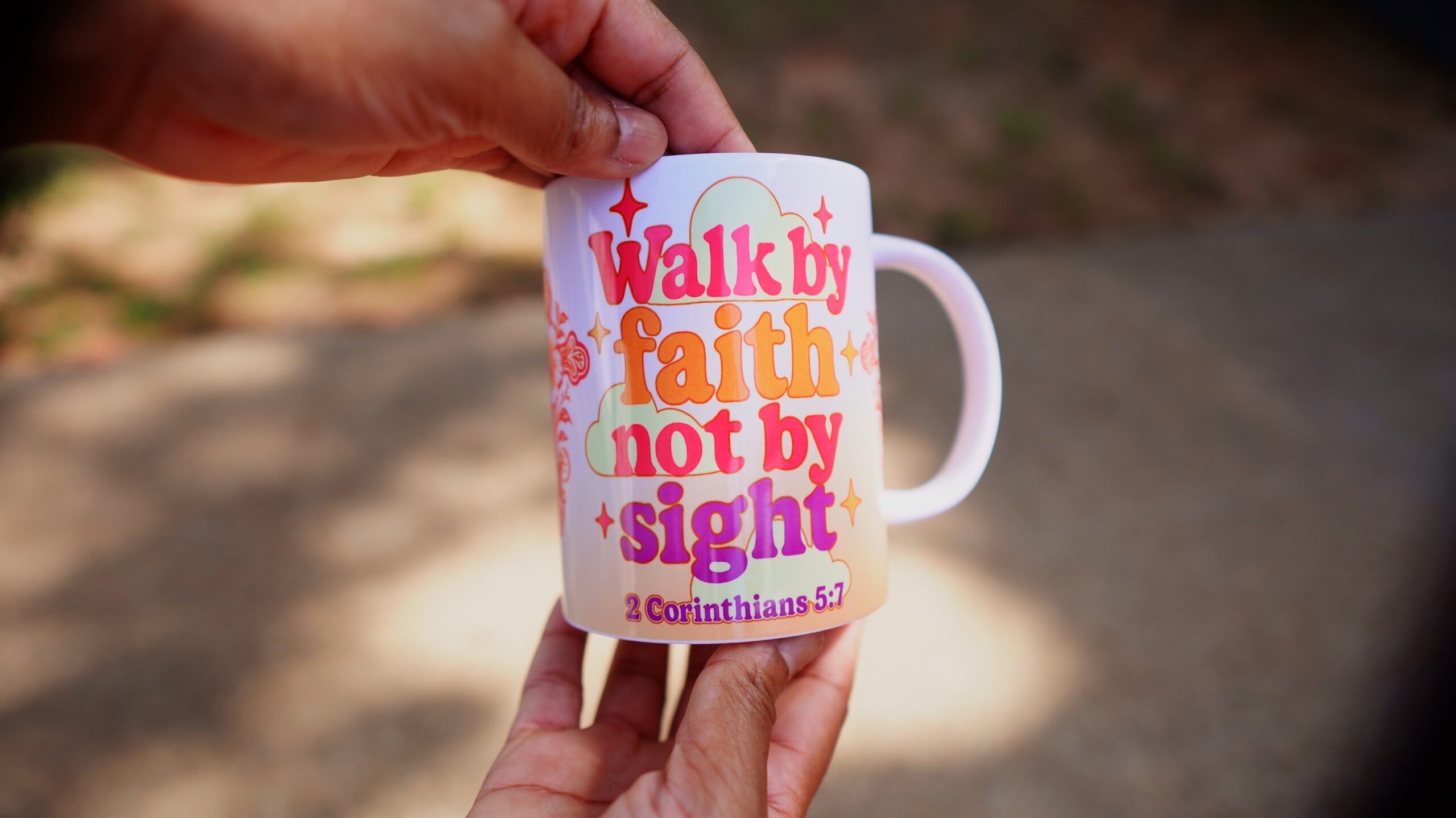 Begin your day with an uplifting reminder from 2 Corinthians 5:7. This 15oz ceramic mug features the inspiring message, “Walk by faith not by sight,” set in a vibrant, retro-inspired design. The warm tones and decorative accents make it a stylish and meaningful addition to your drinkware collection.