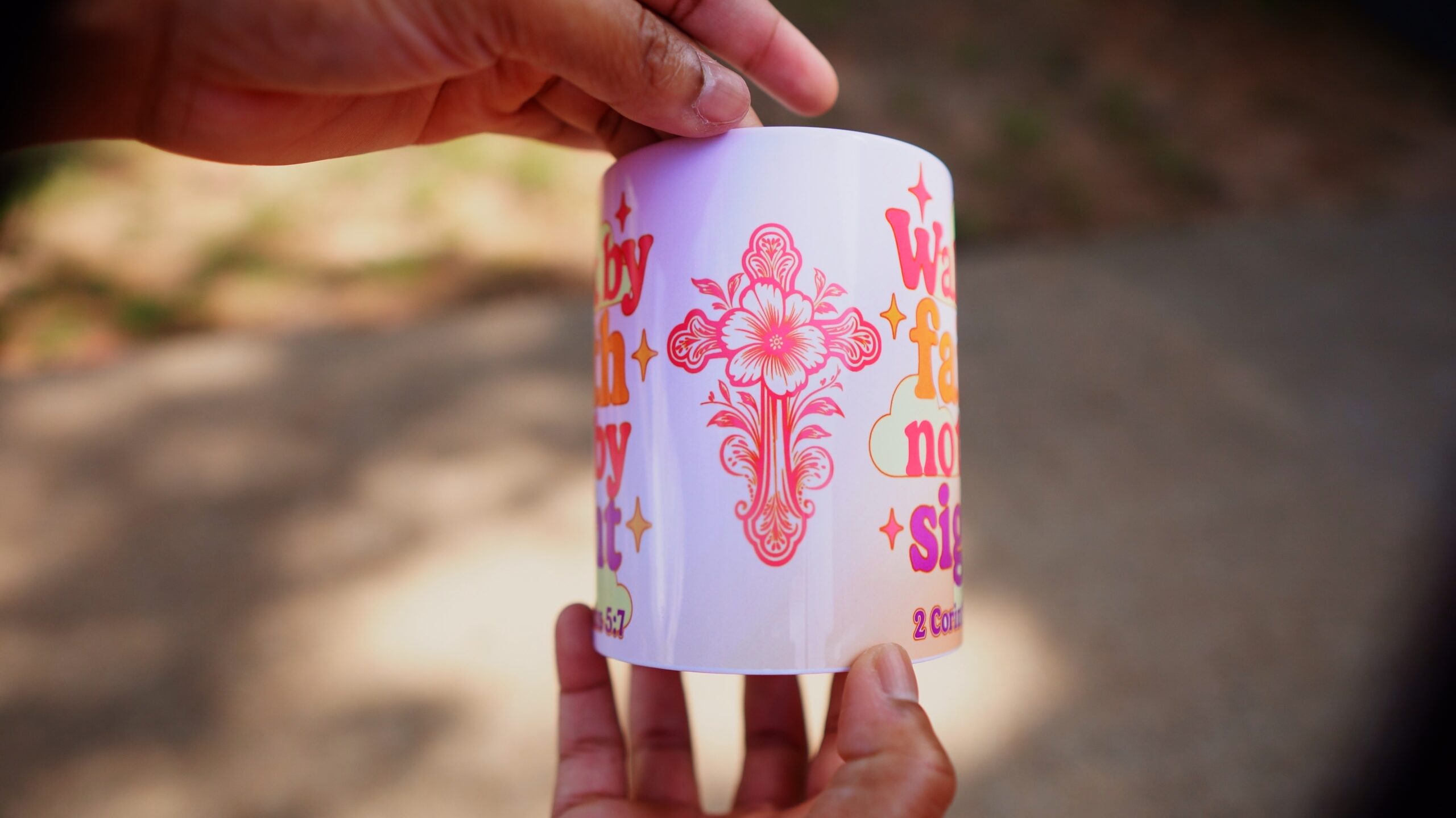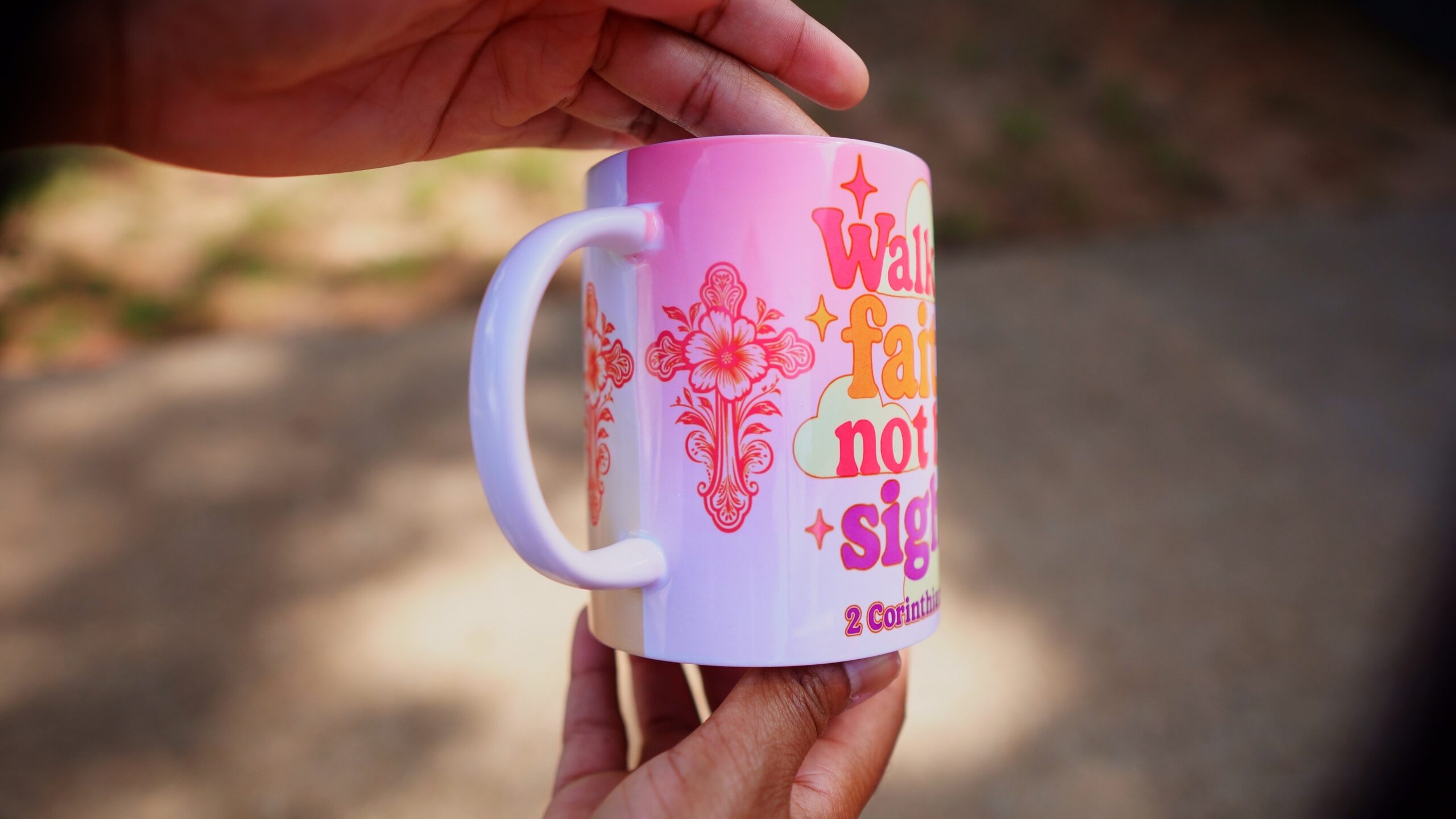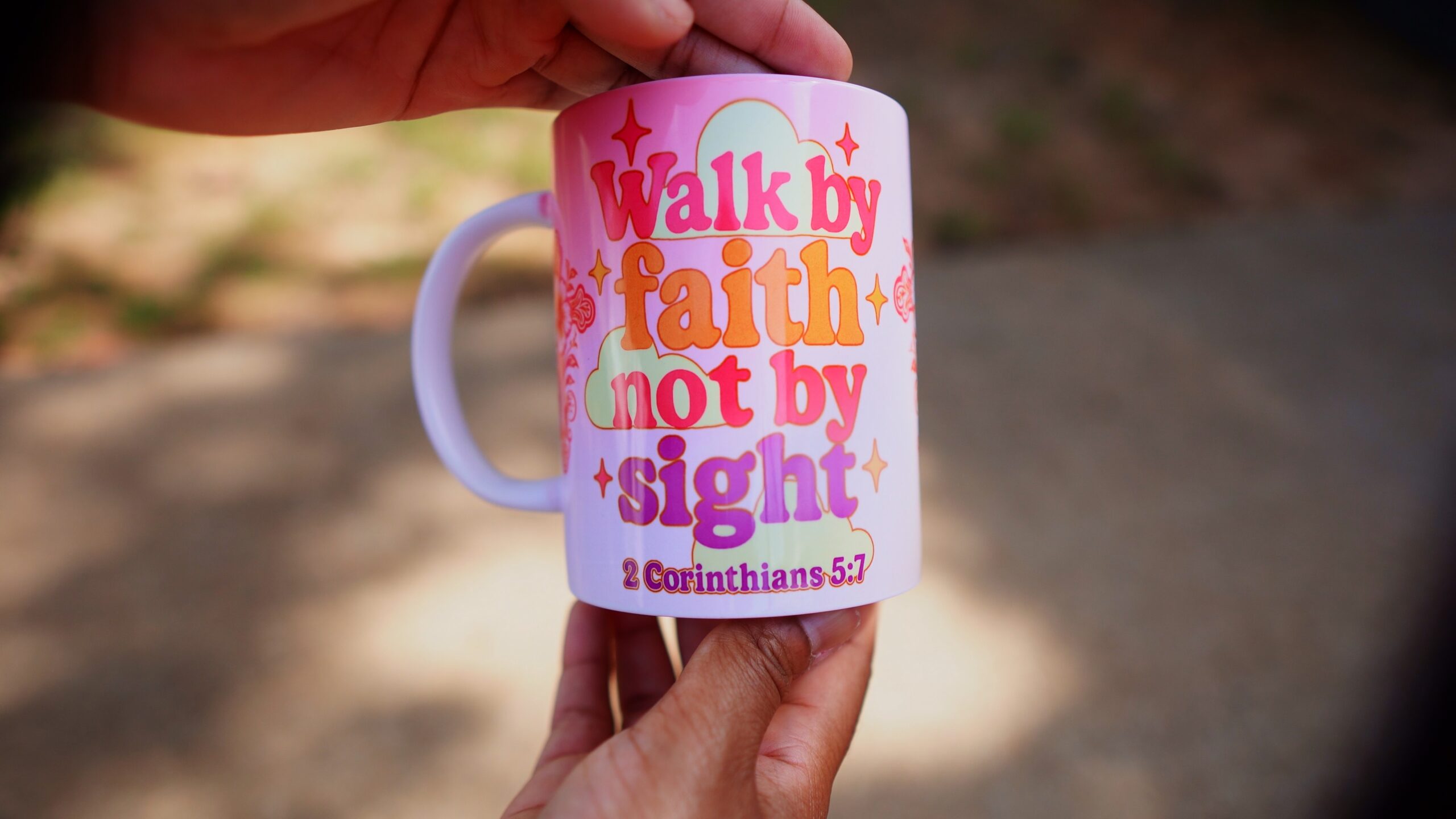 Begin your day with an uplifting reminder from 2 Corinthians 5:7. This 15oz ceramic mug features the inspiring message, “Walk by faith not by sight,” set in a vibrant, retro-inspired design. The warm tones and decorative accents make it a stylish and meaningful addition to your drinkware collection.