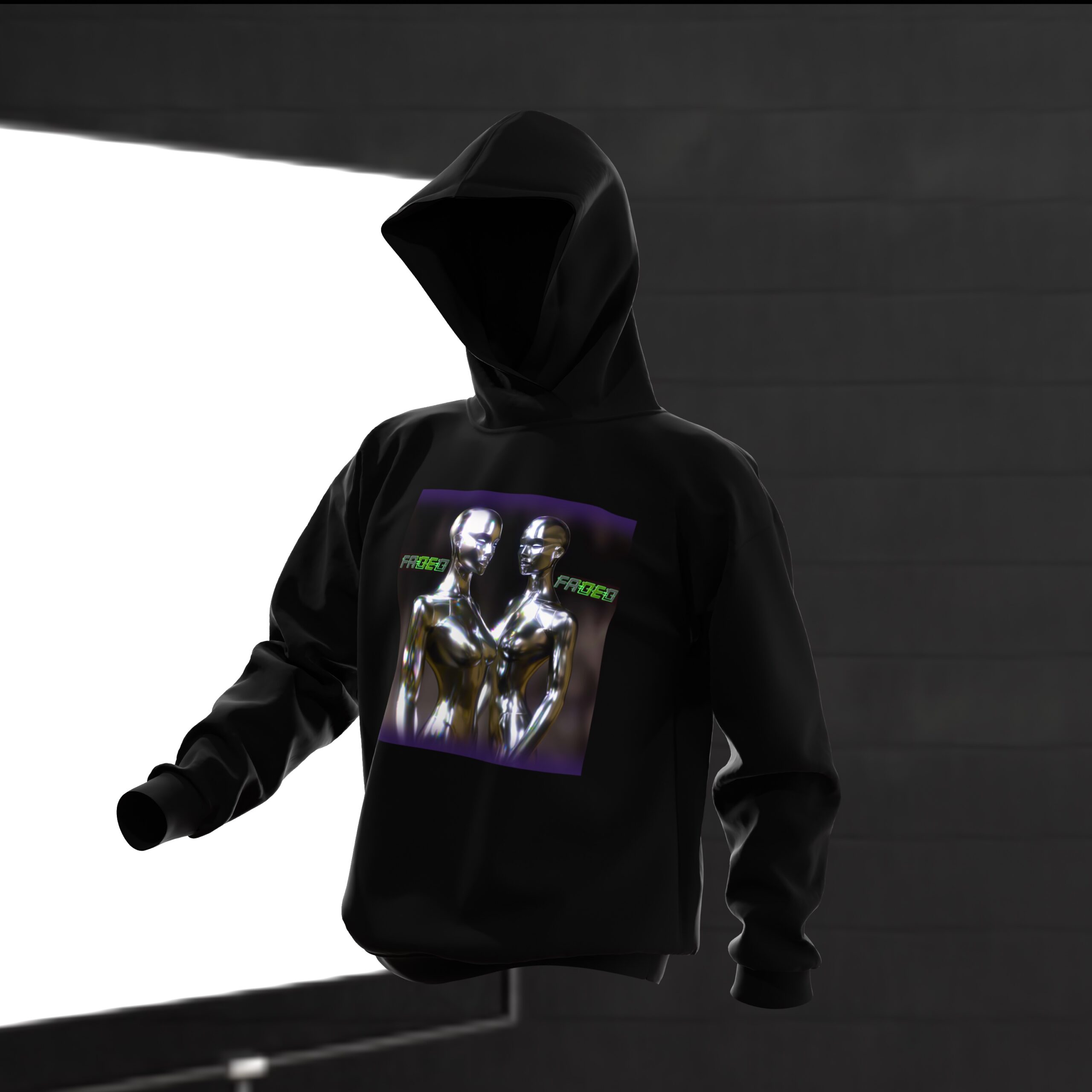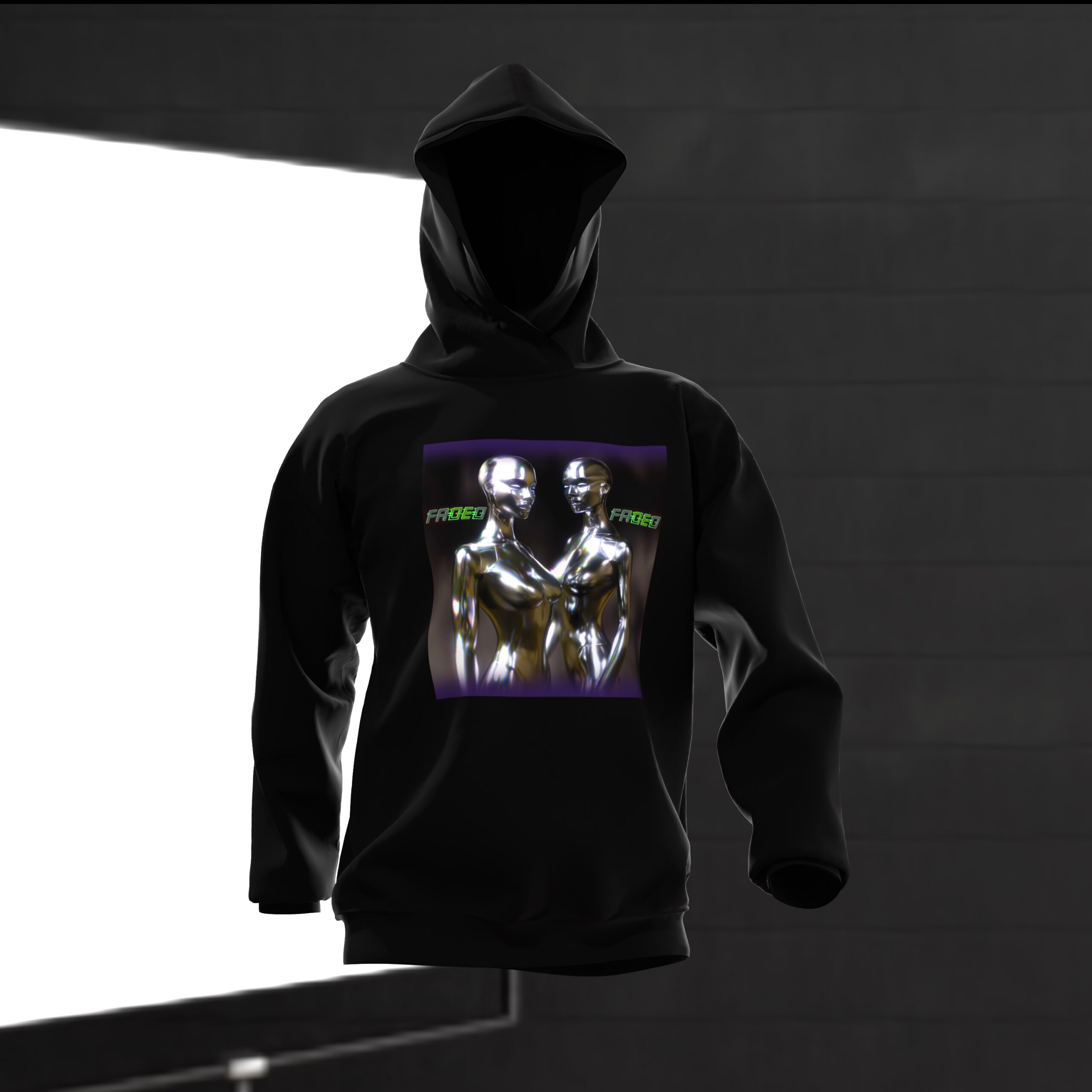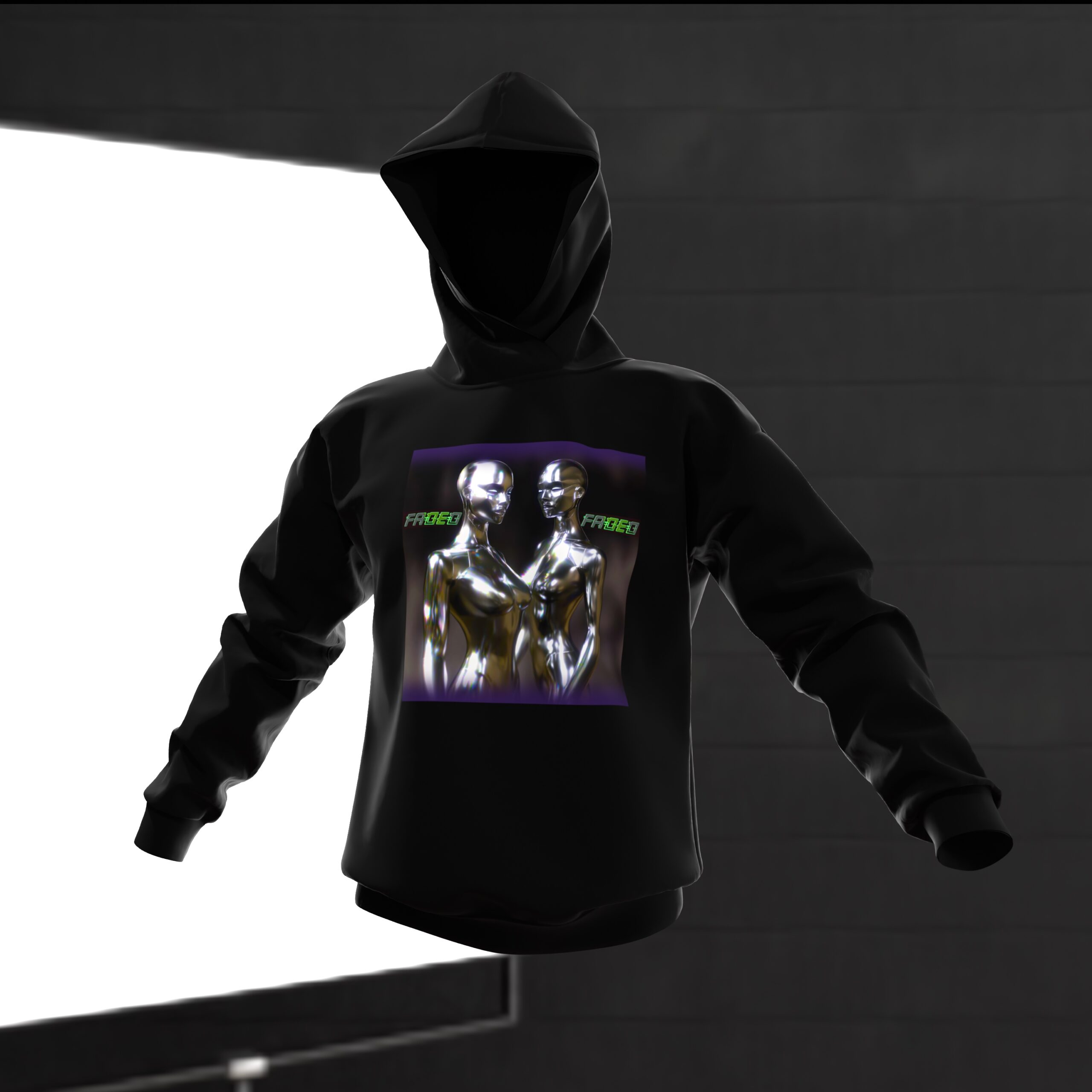 Step into the future with the Faded Chrome Hoodie – where streetwear meets surreal art. This eye-catching unisex pullover features a striking metallic twin-mannequin design with bold “FADED” text, framed in a radiant violet glow.