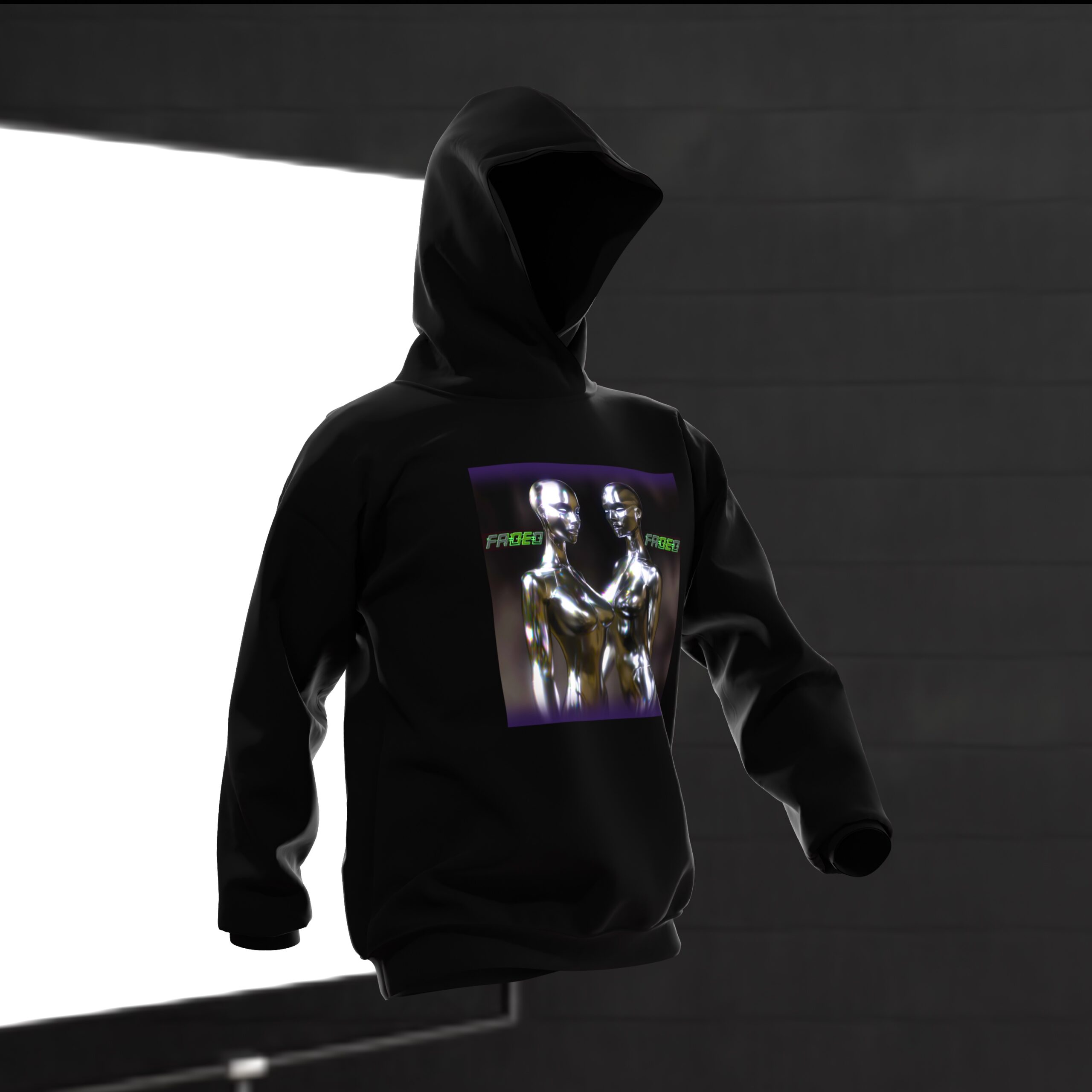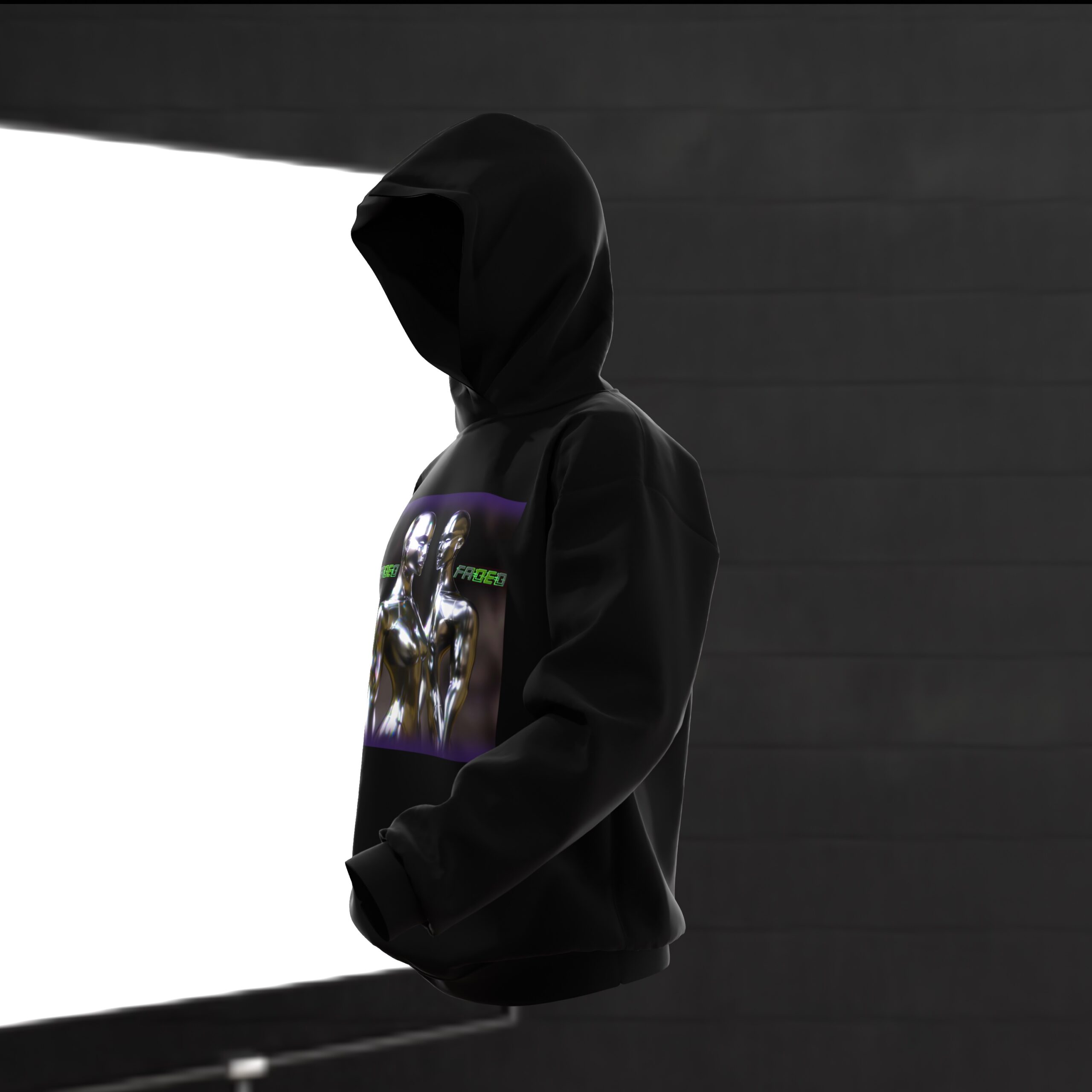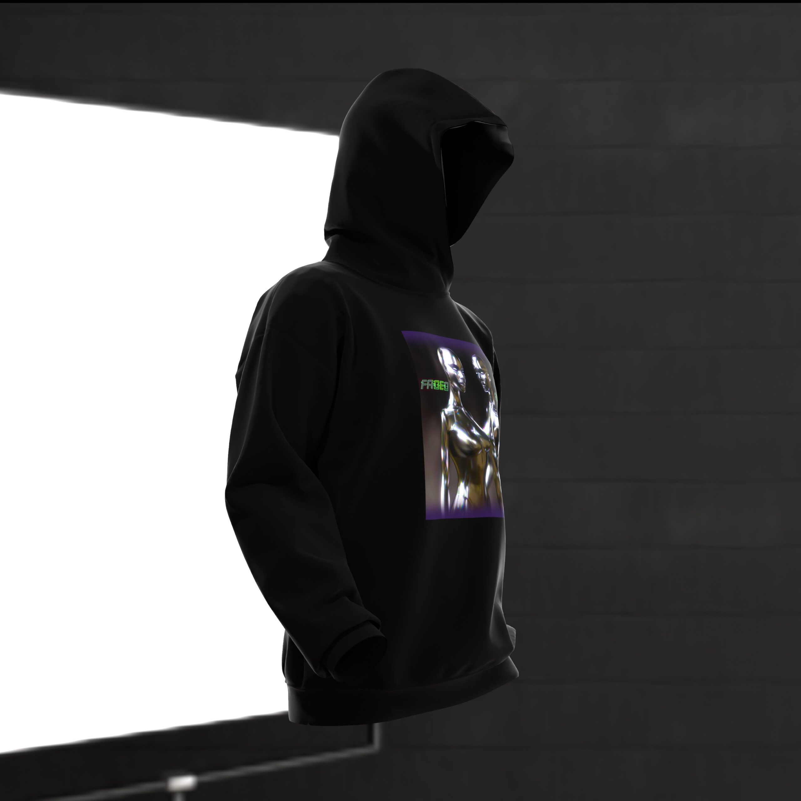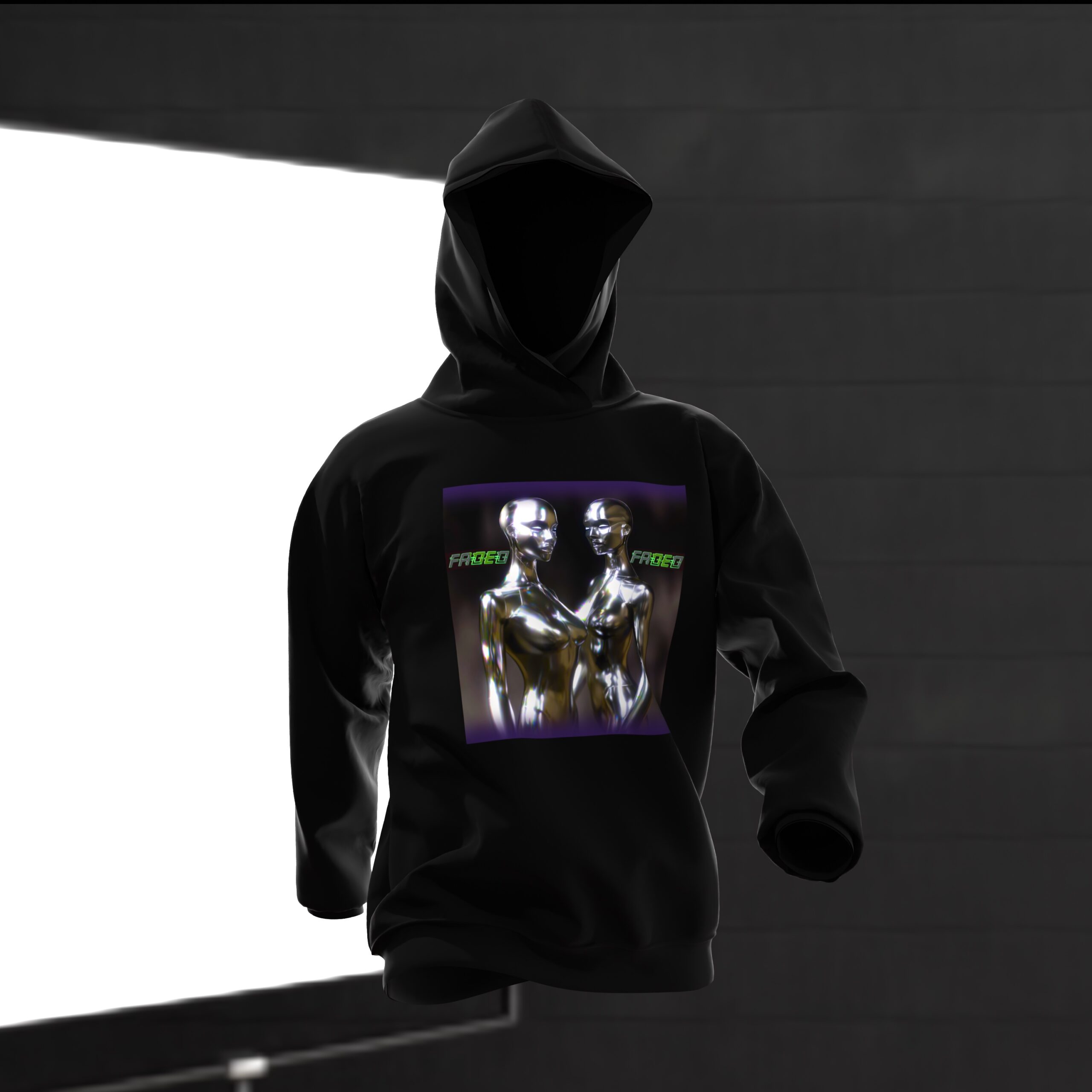 Step into the future with the Faded Chrome Hoodie – where streetwear meets surreal art. This eye-catching unisex pullover features a striking metallic twin-mannequin design with bold “FADED” text, framed in a radiant violet glow.